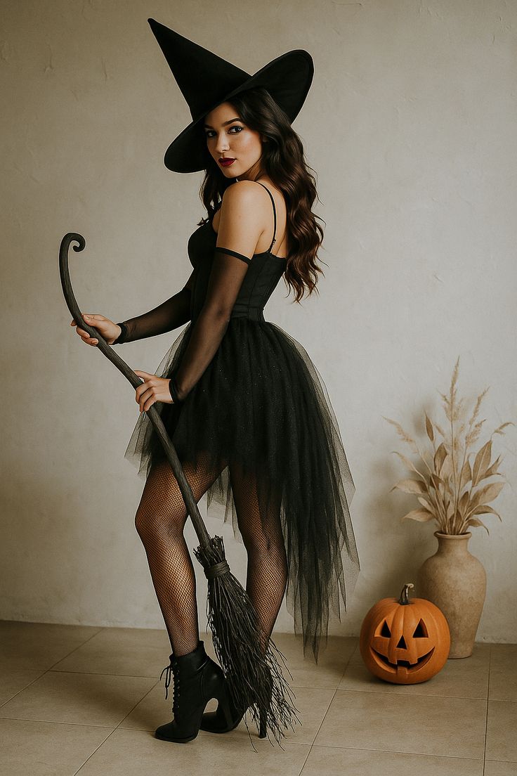 For the perfect finishing touch, get a witch's hat at any stationery store. This costume is classic and doesn't require much effort.