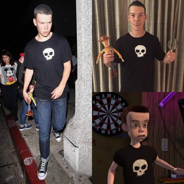 Toy Story Sid Halloween Costume for Men The villain from Toy Story is well-known for his wardrobe. He wears dark blue pants and a black t-shirt. The unique touch is the skull design on the garment.