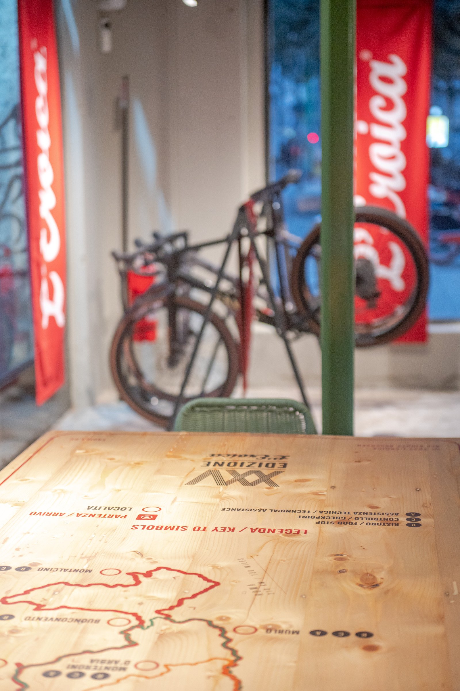 C'est peut-être une coïncidence, mais l'implantation du Caffè Eroica n'est jamais le fruit du hasard : si le Barrino de Gaiole jouxtait une station-service, celui de Milan, Viale Tunisia, a remplacé un magasin d'accessoires automobiles et se situe le long de la piste cyclable, à quelques dizaines de mètres du Corso Buenos Aires, devenu un lieu symbolique – et controversé – de la nouvelle mobilité dans la capitale lombarde. Via Tabacchi, à deux pas de l'Université Bocconi, jouxte l'atelier d'un électricien automobile, grand passionné de vélo et coureur cycliste, que son fils a également poursuivi. Le prochain établissement sera situé au cœur de l'espace vert CityLife, symbole d'un Milan plus vivable et à taille humaine.