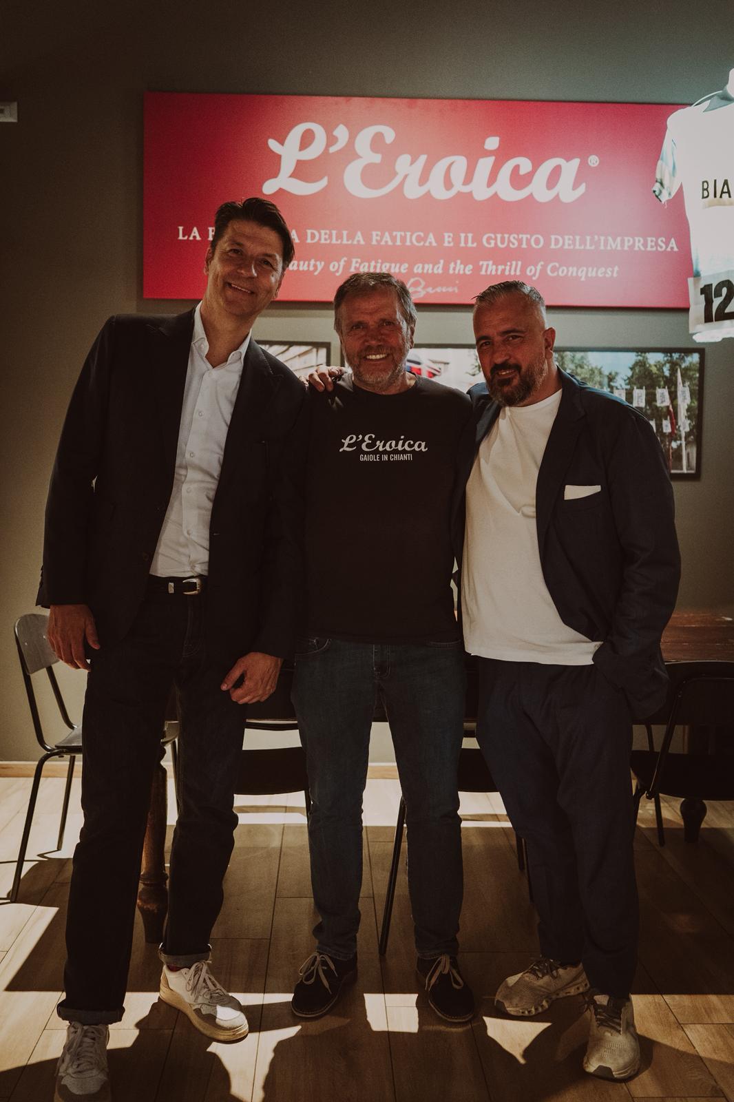 Le président d'Eroica Nicola Rosin, le créateur Giancarlo Brocci et le directeur de Caffè Eroica Ivan Totaro
