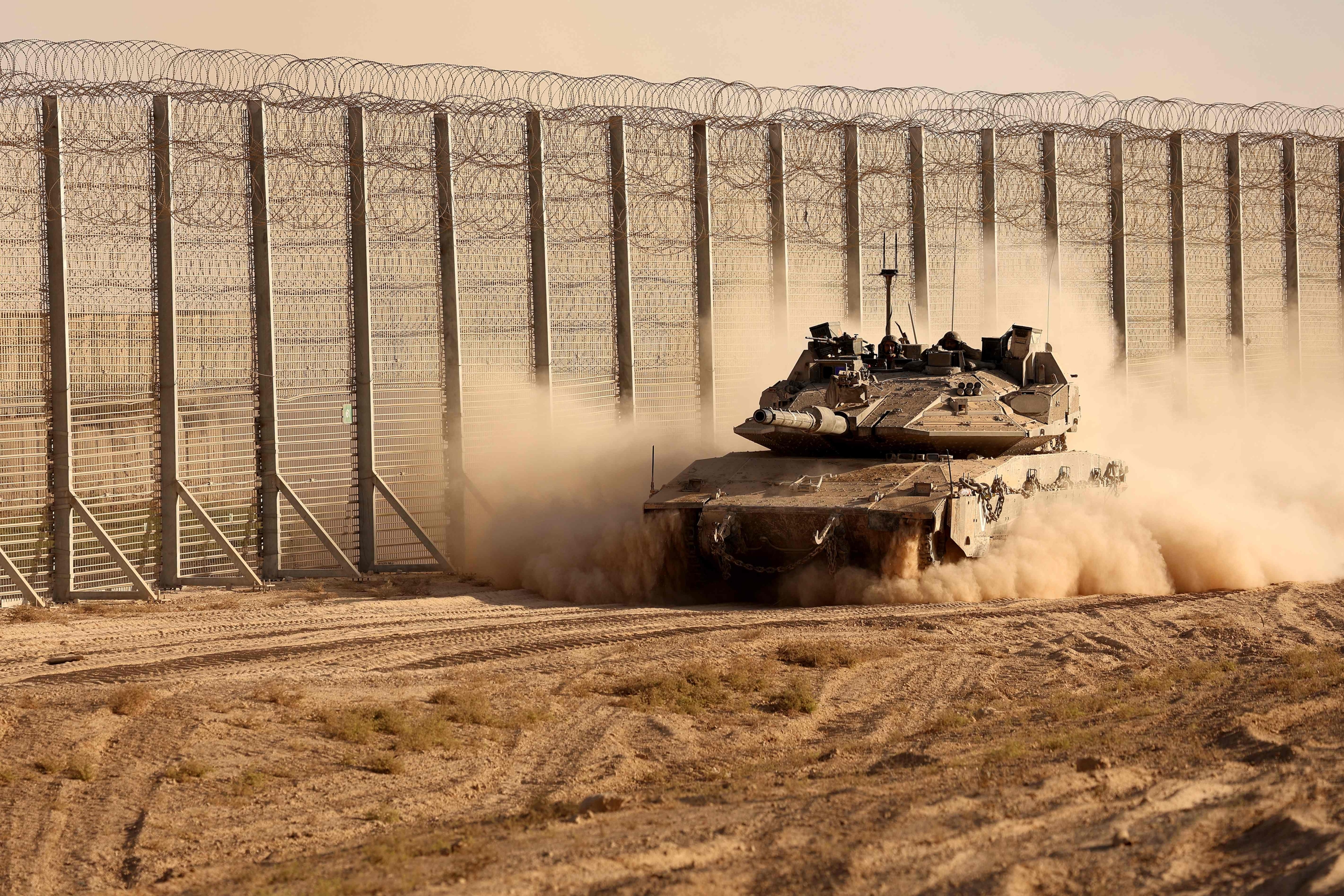 Un carro armato dell'esercito israeliano avanza lungo la recinzione di confine tra Israele e Gaza. Foto: AFP