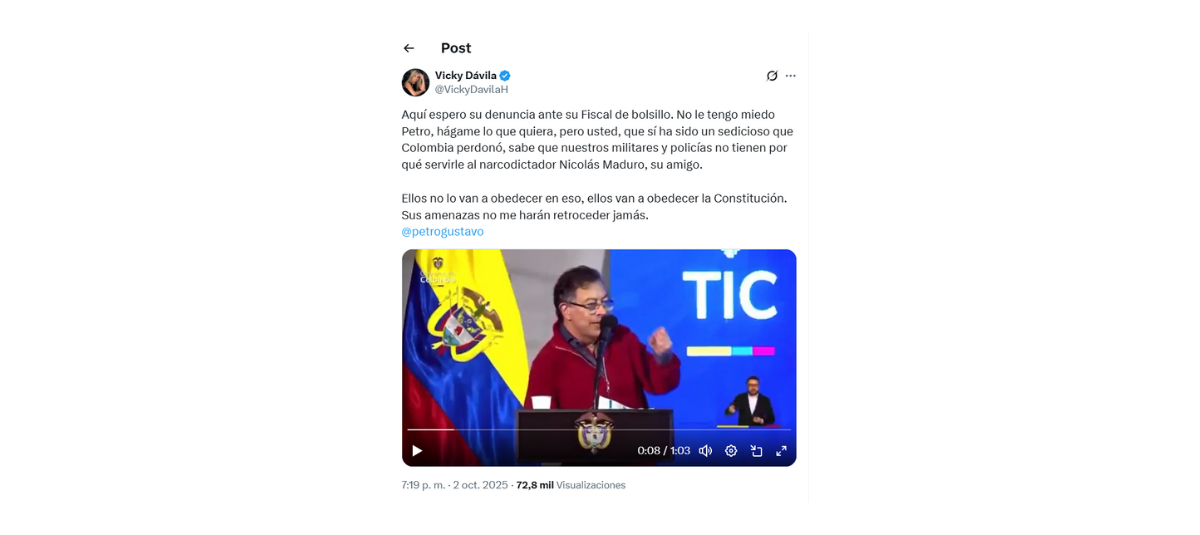 Petro non ha fatto nomi specifici, ma le sue dichiarazioni sono state interpretate come una risposta diretta al discorso pronunciato da Vicky Dávila qualche giorno prima a Sabaneta, Antioquia, durante un evento elettorale.